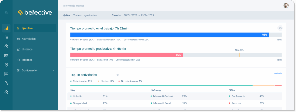 Descubre cuánto tiempo se dedica a herramientas de trabajo vs. distracciones como WhatsApp o redes sociales.